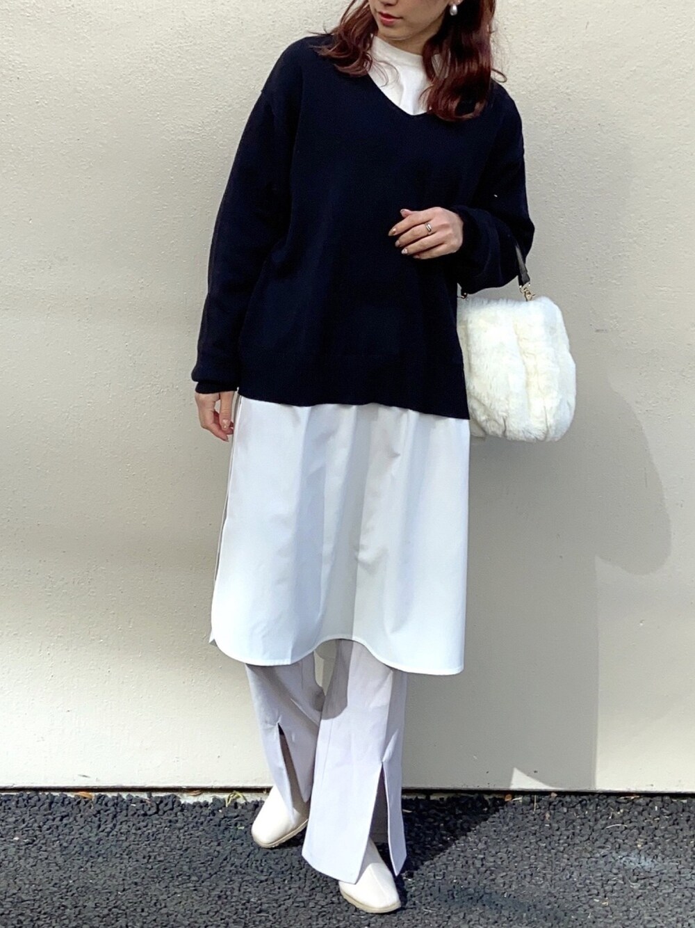 . おはようございます🐰🍃 ご覧いただきありがとうございます♪ . 春まで着られるフェイクレイヤードニットワンピース🧶 センタースリットのパンツも春までピッタリなパープルで女性らしさもプラス👀