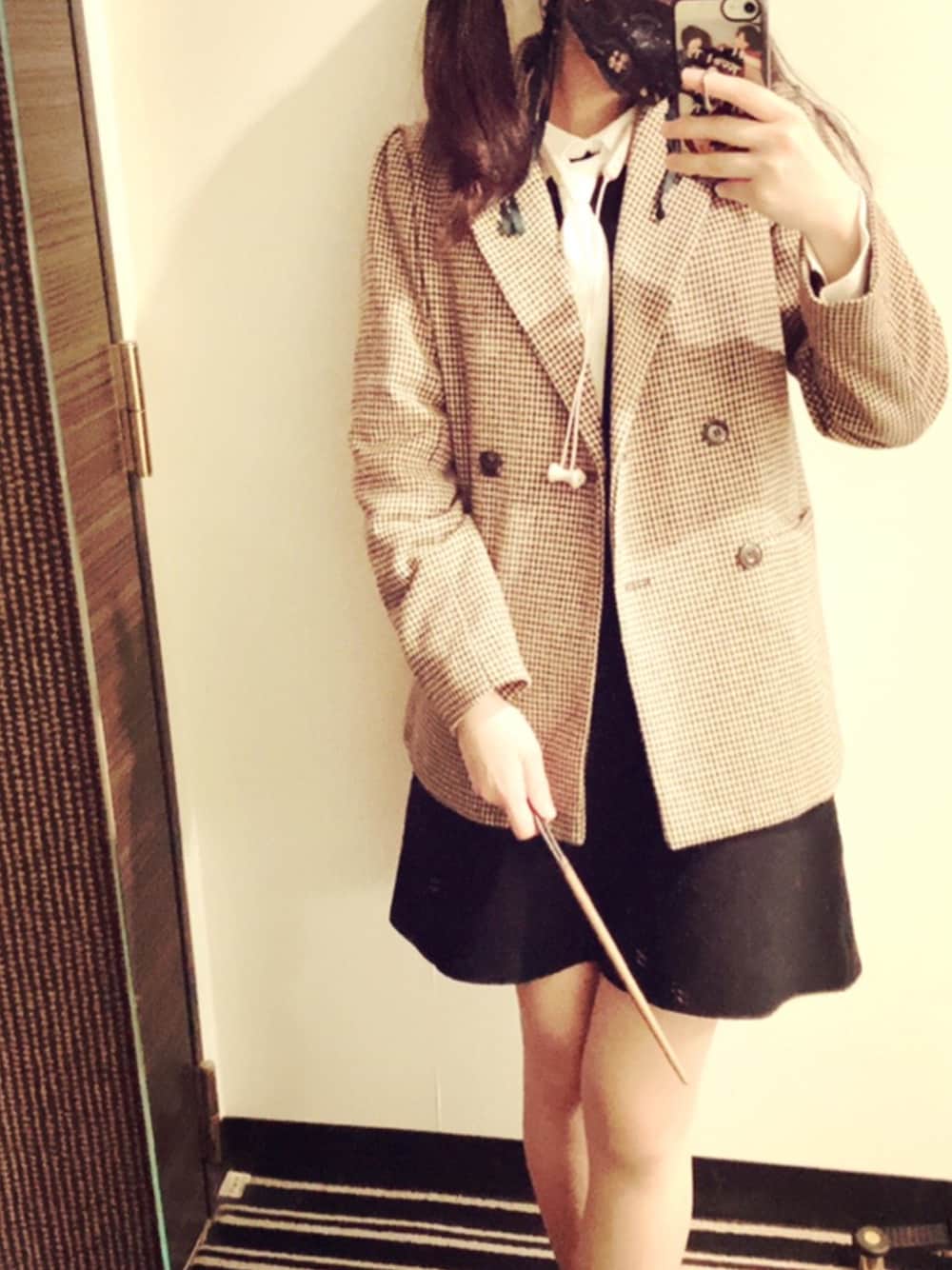 ハリポタ展へ。 ニットワンピのリボンをネクタイ結びにして、ちょっとハリポタ感出してみました😌 マスクもハリポタコラボ🙆♀️