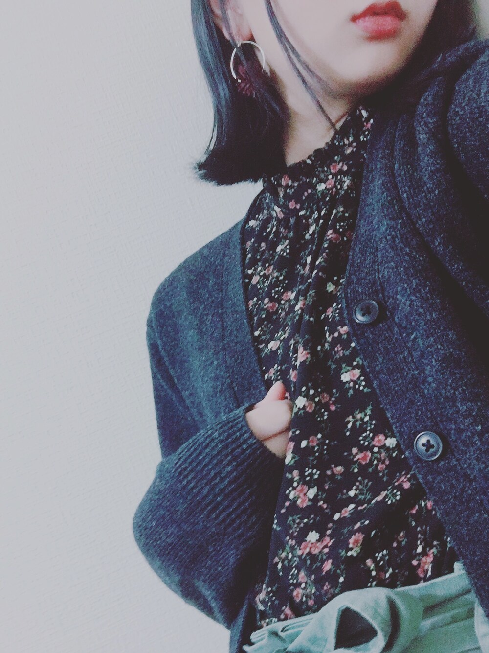 #autumn #小花柄 #カーディガン #black #UNIQLO #earth #外ハネ #167 #ポイントはイヤリング