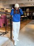 ブルーのフーディーが主役のコーディネート! パンツも同じインターナショナルで揃えました♡ 上下スウェットでラフ過ぎるかな? と思ったのでビーニーやメガネの小物をプラスして お洒落感アップ⤴︎︎⤴︎︎