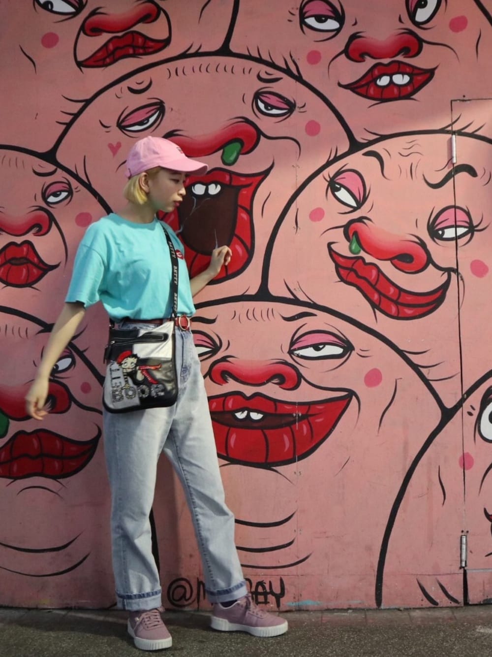 RRRのピンクのキャップと、プーマのパープルのスニーカーの組み合わせがお気に入り!! Tシャツはだいすきなターコイズ❤︎