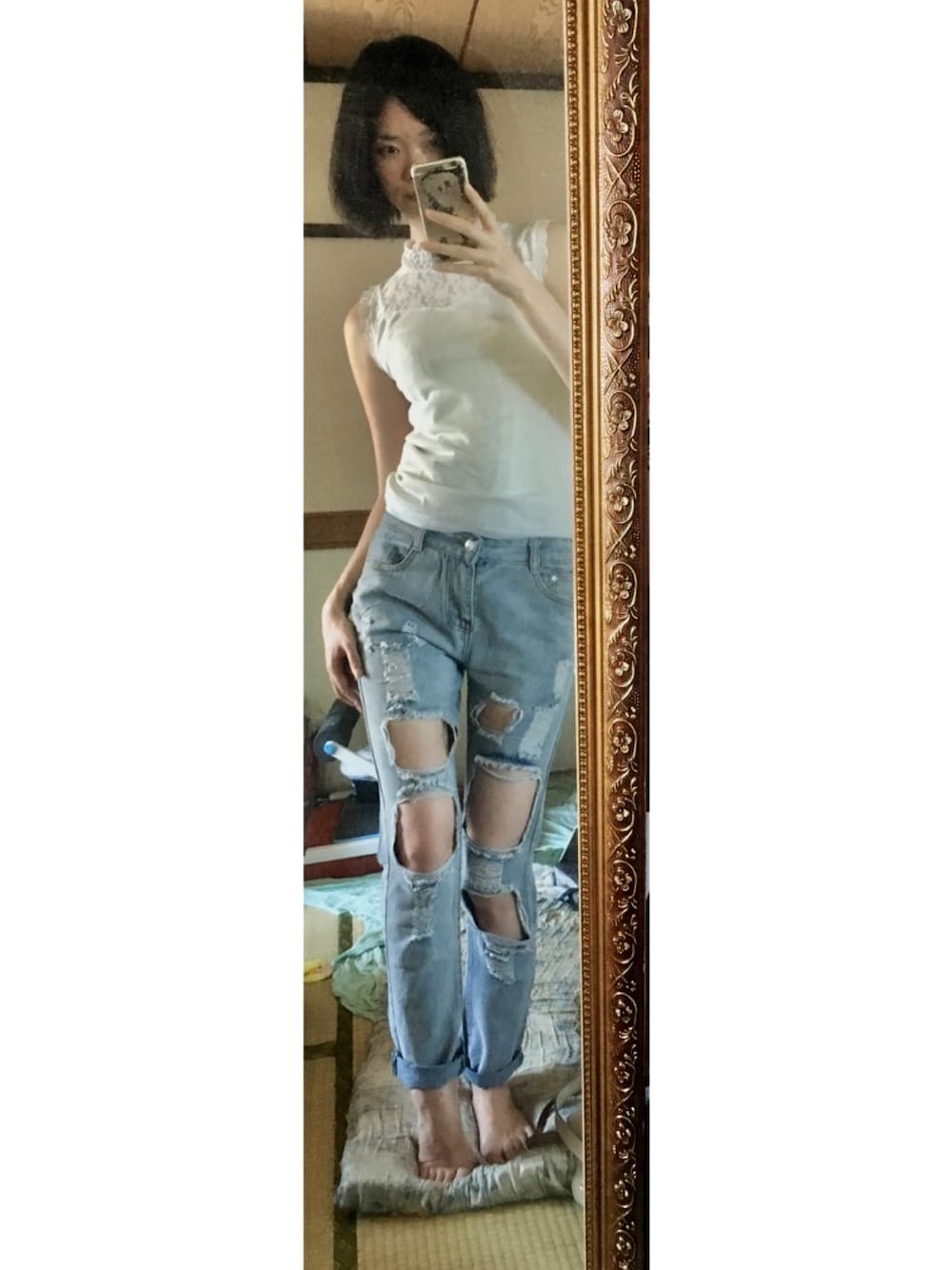 Amazonでクラッシュデニム。サイズ良くてお気に入り。700円ってお値打ち。いい買い物できました。 ノースリーブ理想的だったので即買い。 色違で黒も欲しくなってる。