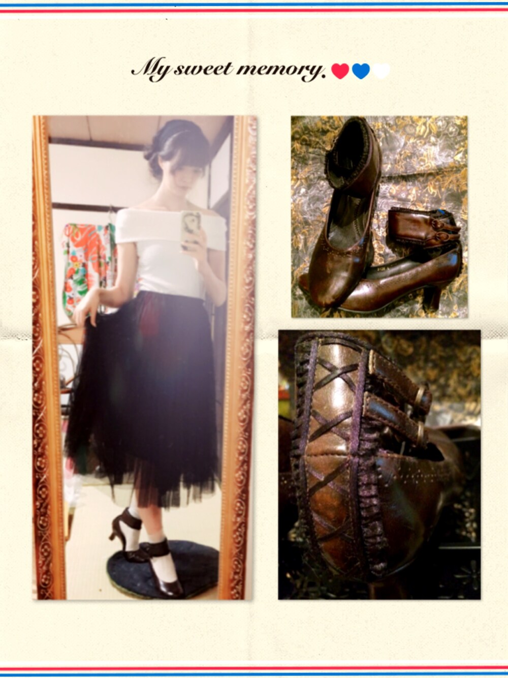 思い描いていたトップスが買えました♡ 馴染みのリサイクルショップで。¥180٩(ˊᗜˋ*)و クラシカルにコーデしてみました。 友達と交換したパンプスは凝ってて素敵です。
