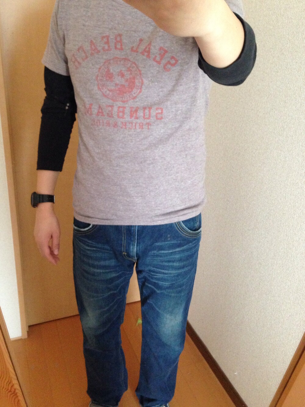 ロンTとの重ね着。 デニムはロールアップが必須