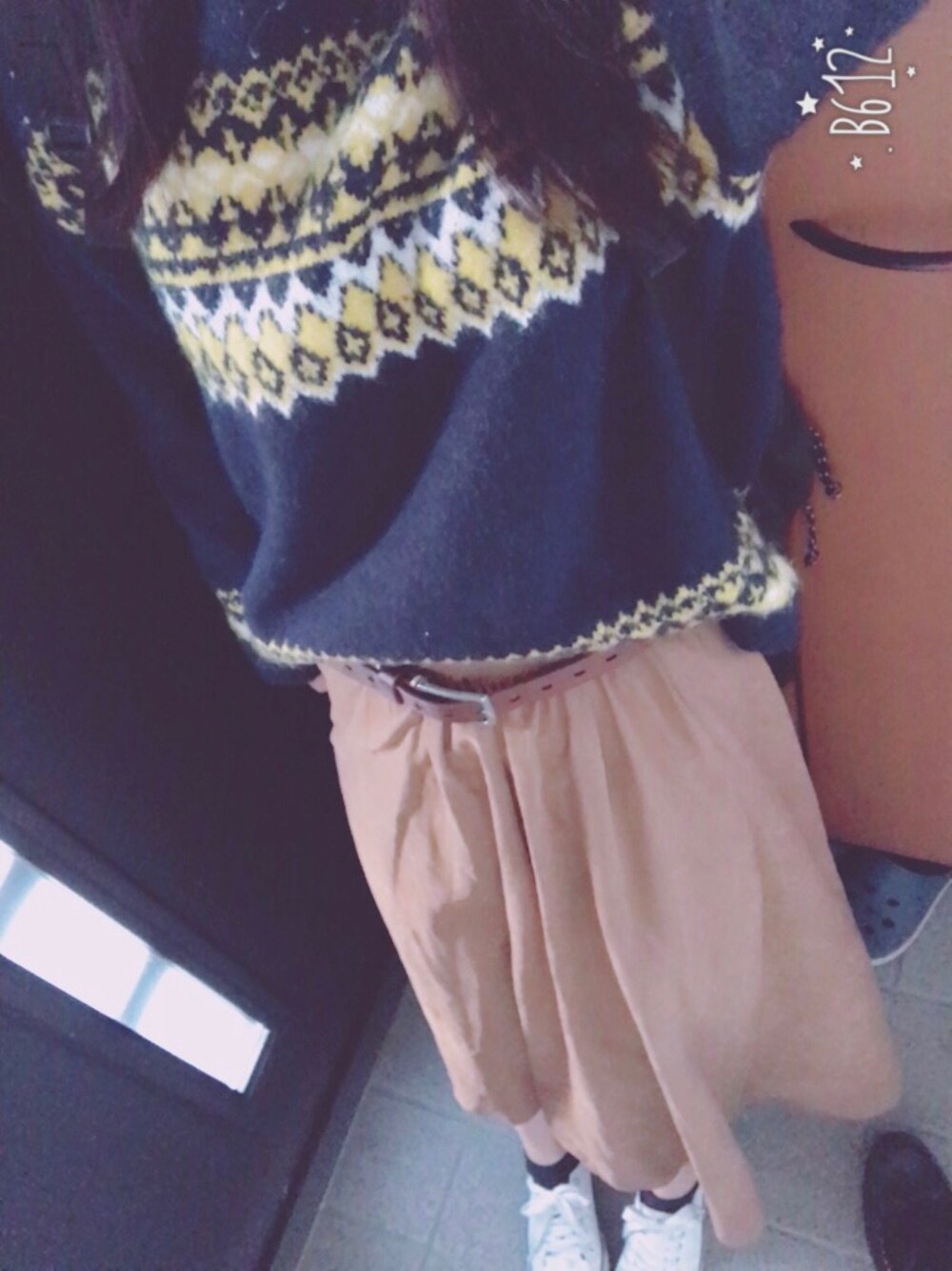 その他のニット/セーター、ベージュ系のスカート、ホワイト系のスニーカーを着用したレディースの秋コーディネートの1枚目の写真