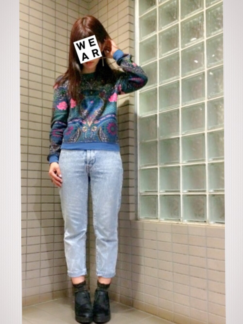 マヌーシュのプリントスウェットを こないだゲットしたのでさっそく♡ ボトムはこないだまで働いてた 古着屋さんで♩ ちょっとゆるめです♢ 十字架ピアスはラフォーレのセールで♩
