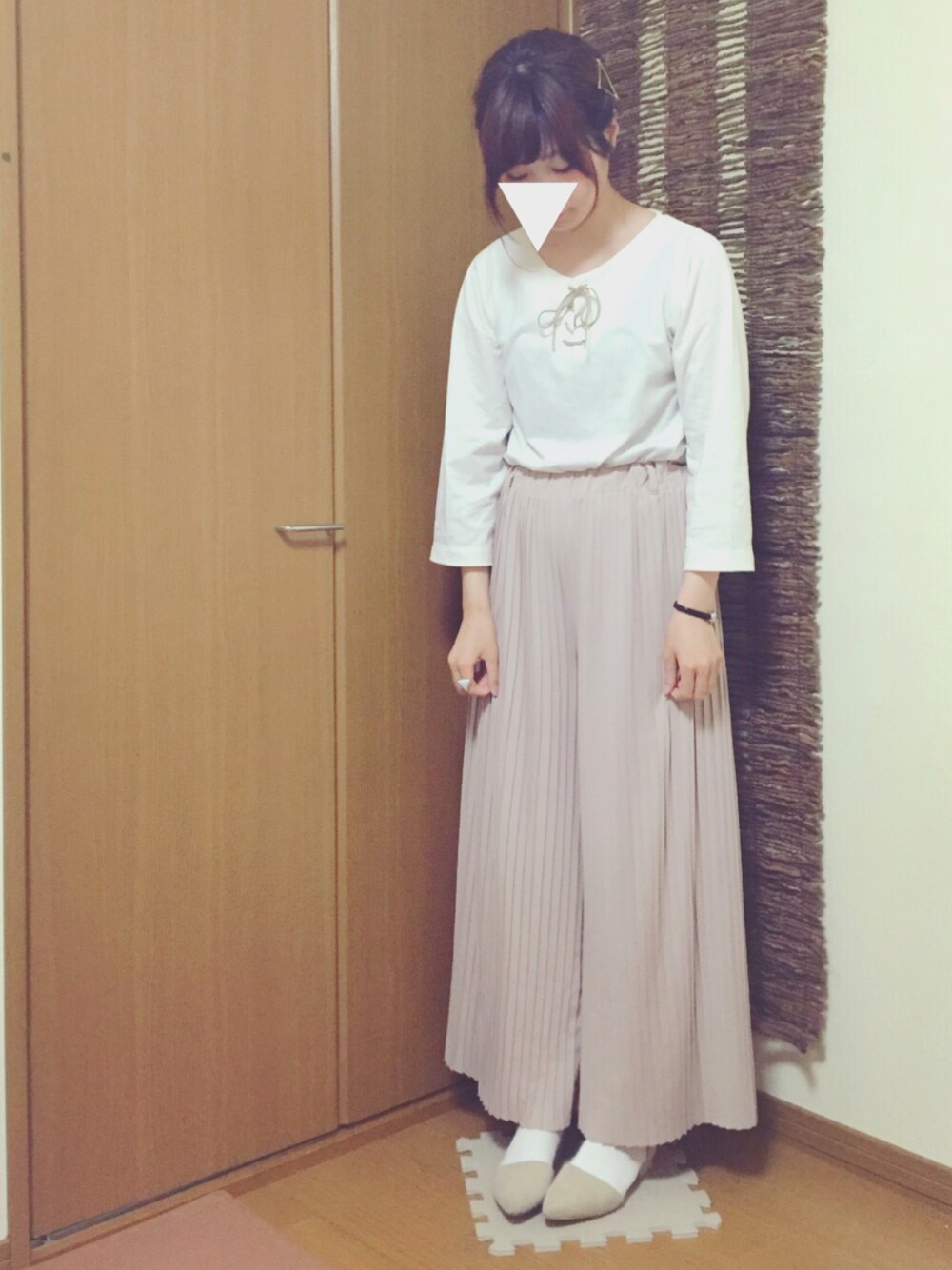 最近ピンクベージュが好きです。 アクセサリーは300円のお店です