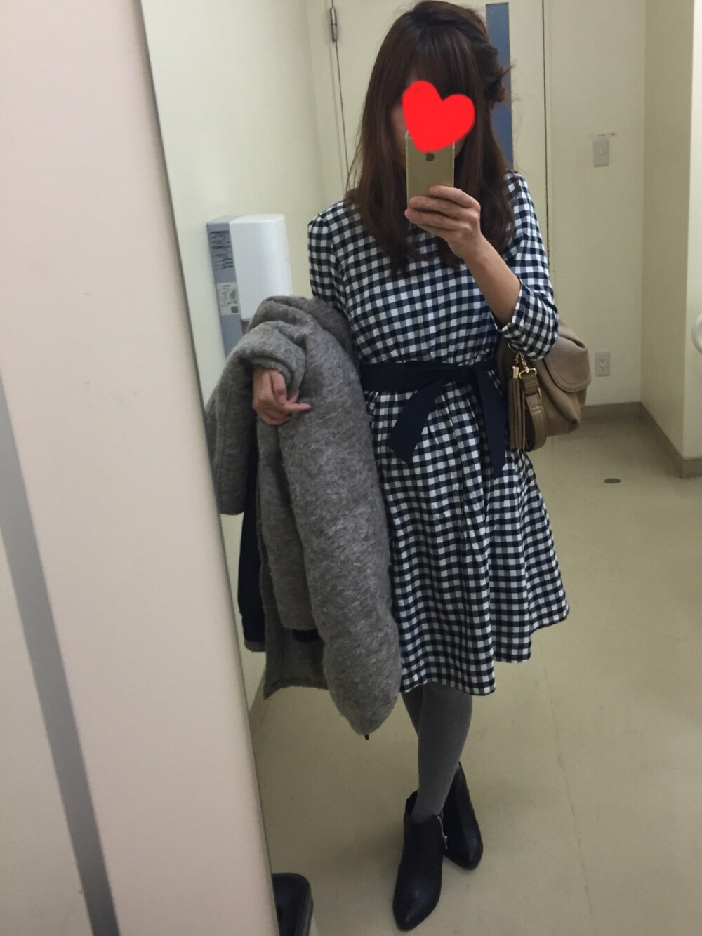 定番のギンガムチェックワンピースで♫ コートの下はもう春なのだ。