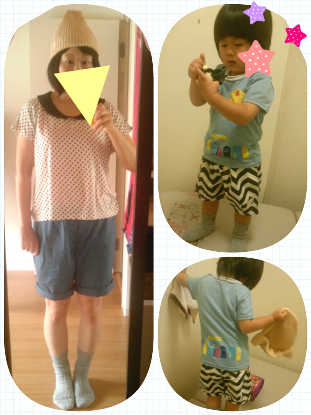 靴下だけグレーでリンクしようかーと合わせたのだけど、ふと気付けば… 白×黒、ブルー、グレー 色使い一緒やった。笑 UNIQLOイージーをロールアップ♪