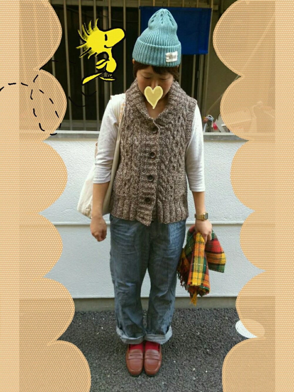 七分袖…ベストで暖を取る作戦。 それだけじゃ寒いかもと、中はオーバーオール、手にはストール。 結果、良い天気の日中は暑く、ベストは脱ぎ、ストールは使用せず、ただの荷物になりました(゜_゜)