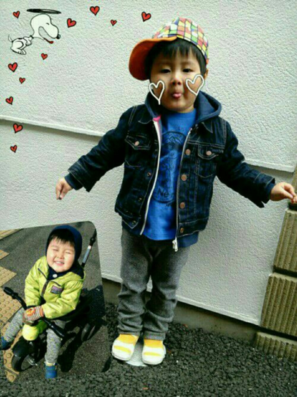 ポーズして~って言ったらこの顔…なんちゅう顔や(゜_゜) 左下のは、帽子じゃなくてインナーのフードを被ると主張した日の斬新なコーデ(((^^;) 何かぱつぱつで全身タイツのフードみたいやし凄い顔やし…笑