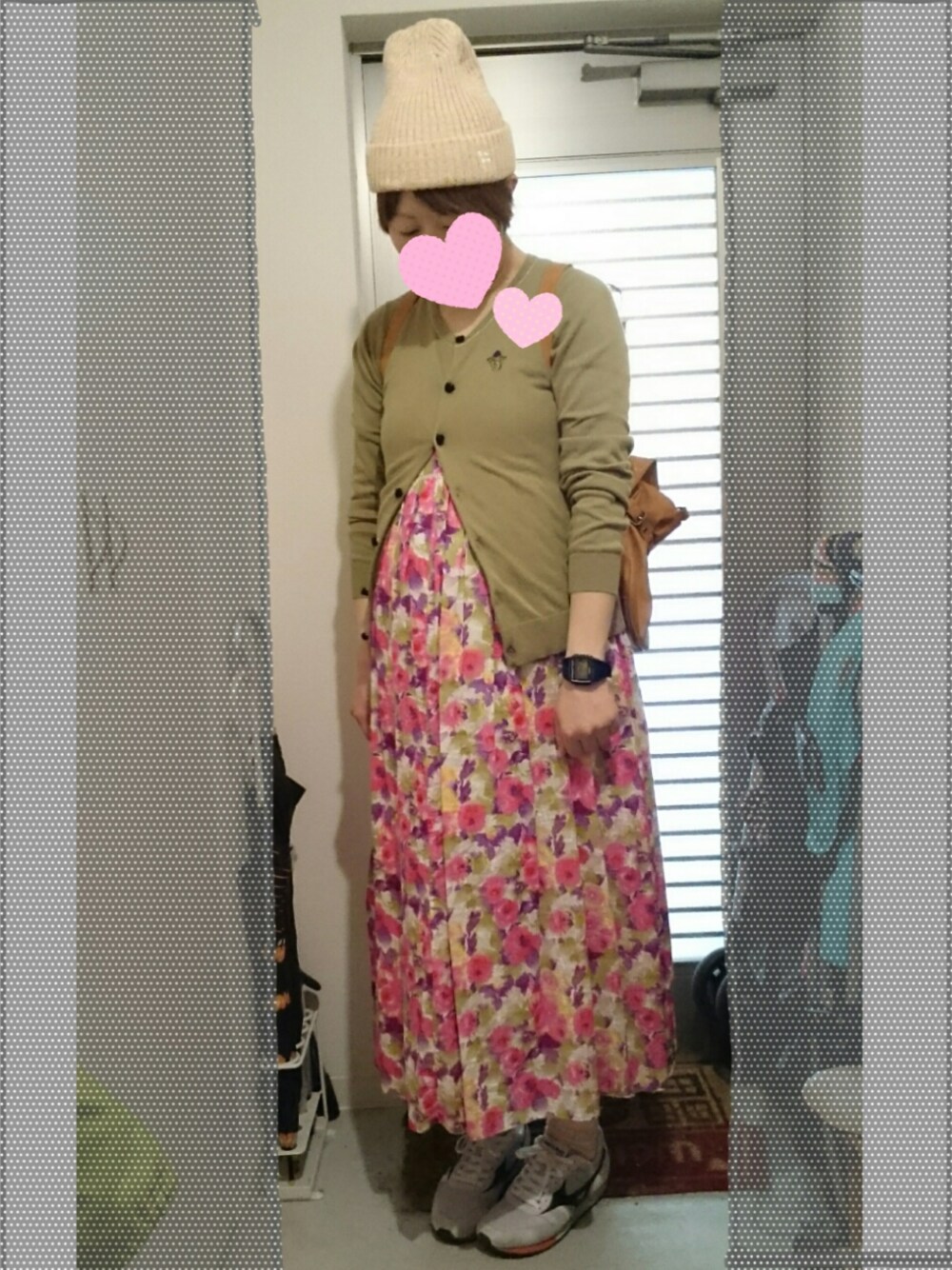 カーデのボタン全部閉めて着たかったのに、お腹が出過ぎておかしな事になったので開けるしかなく(T-T)
