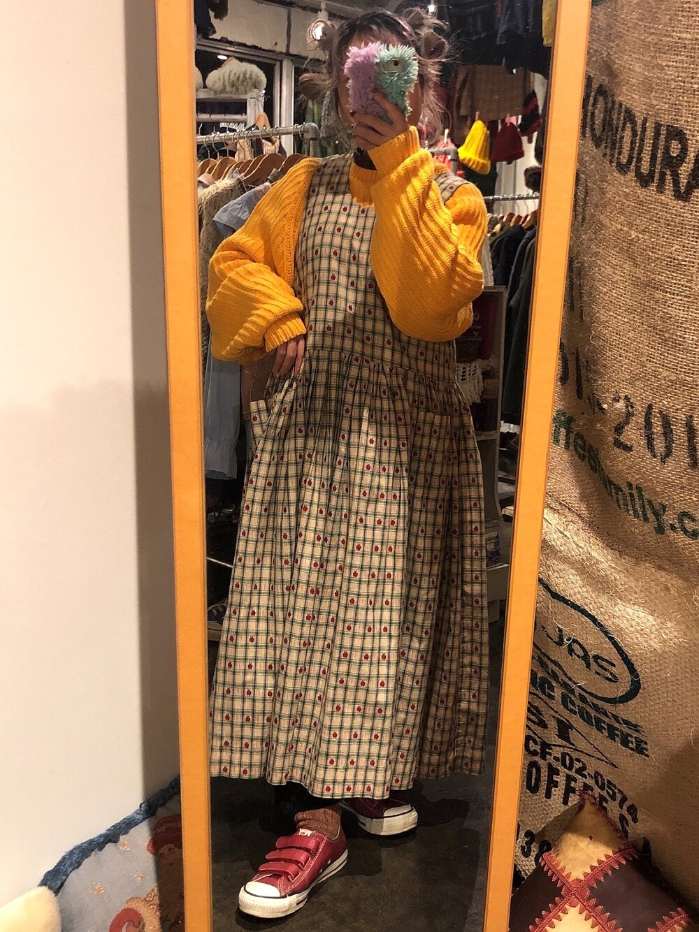 💛old GAPのニットはじょんぬんの 🍏りんご柄のエプロンワンピはなおちゃんから譲っていただいたの ❤️90's CONVERSEベロクロレザー