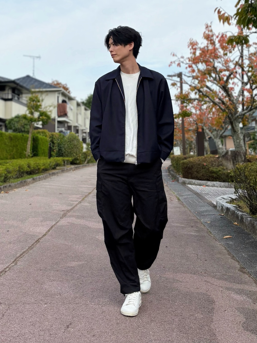 『自分をより良く見せる為に服を着る』 ご覧いただき、ありがとうございます🙇♂️ 素人コーデにはなりますが、もしご覧いただいた方の何か参考になれば幸いです😄 身長:179cm 体重:67.5kg シンプルですが、清潔感と落ち着きを意識したコーディネートです。 ネイビーのブルゾンに白ニットを合わせて、上半身を明るく爽やかに。 ボトムスはUNIQLOのワイドフィットカーゴパンツでほどよく抜け感を出しました。 足元はBIRKENSTOCKのレザースニーカーで上品さをプラスしています👟 気温が少し下がってくる11月初旬の街歩きやカフェ時間にぴったりなスタイルです☕ 「シンプルだけどきれいめ」「大人っぽく見せたいけどラフに着たい」 そんな方の参考になれば嬉しいです! 👕 着用アイテム ・ブルゾン:tk.TAKEO KIKUCHI(カラー:ネイビー/サイズ:L) ・ニット:UNIQLO ウォッシャブルコットンクルーネックセーター(オフホワイト/XL) ・パンツ:UNIQLO ワイドフィットカーゴパンツ(ブラック/S) ・スニーカー:BIRKENSTOCK BEND LOW(ホワイト/41)
