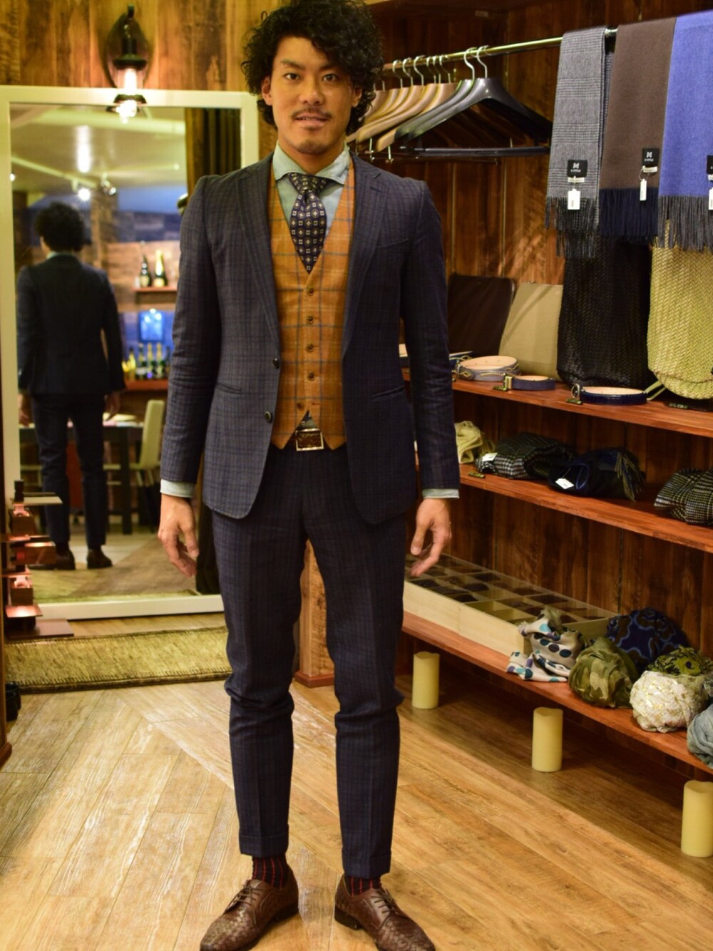 柄違いのベストを差したスリーピーススタイルです! 立体感をポイントにネクタイとジレの柄を合わせ、暖色のオレンジでコーディネートに暖かみを入れてみました!