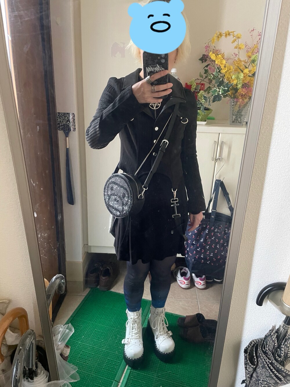 ご覧いただきありがとうございます😊 玄関なんでだいぶゴタゴタしてます😓 寒くなかったのでちょっと薄着でちょいゴス✨ タイツは写真じゃ分からないけど青のキレイなグラデなのです… ブーツは厚底🥾