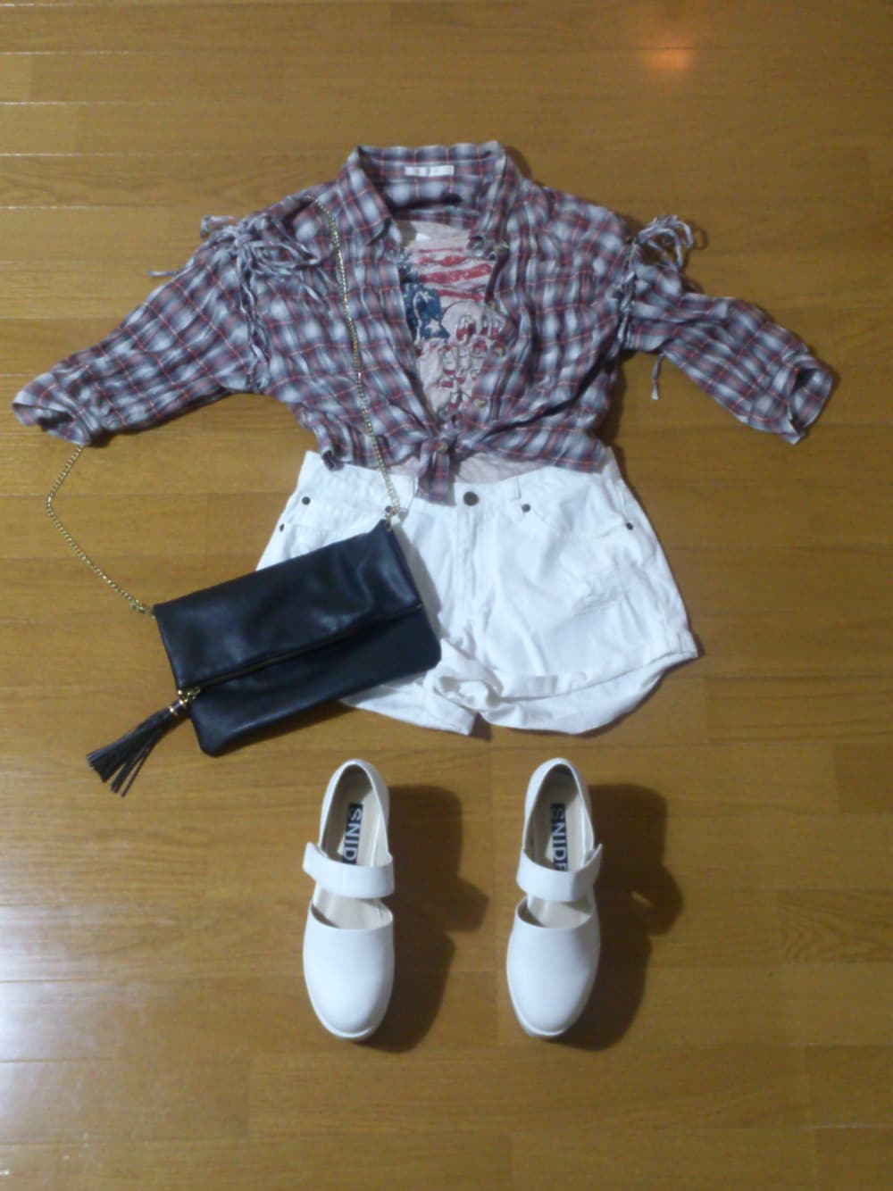 シャツ→COCODEAL Tシャツ→COCODEAL ショートパンツ→COCODEAL 靴→snidel バック→H&M