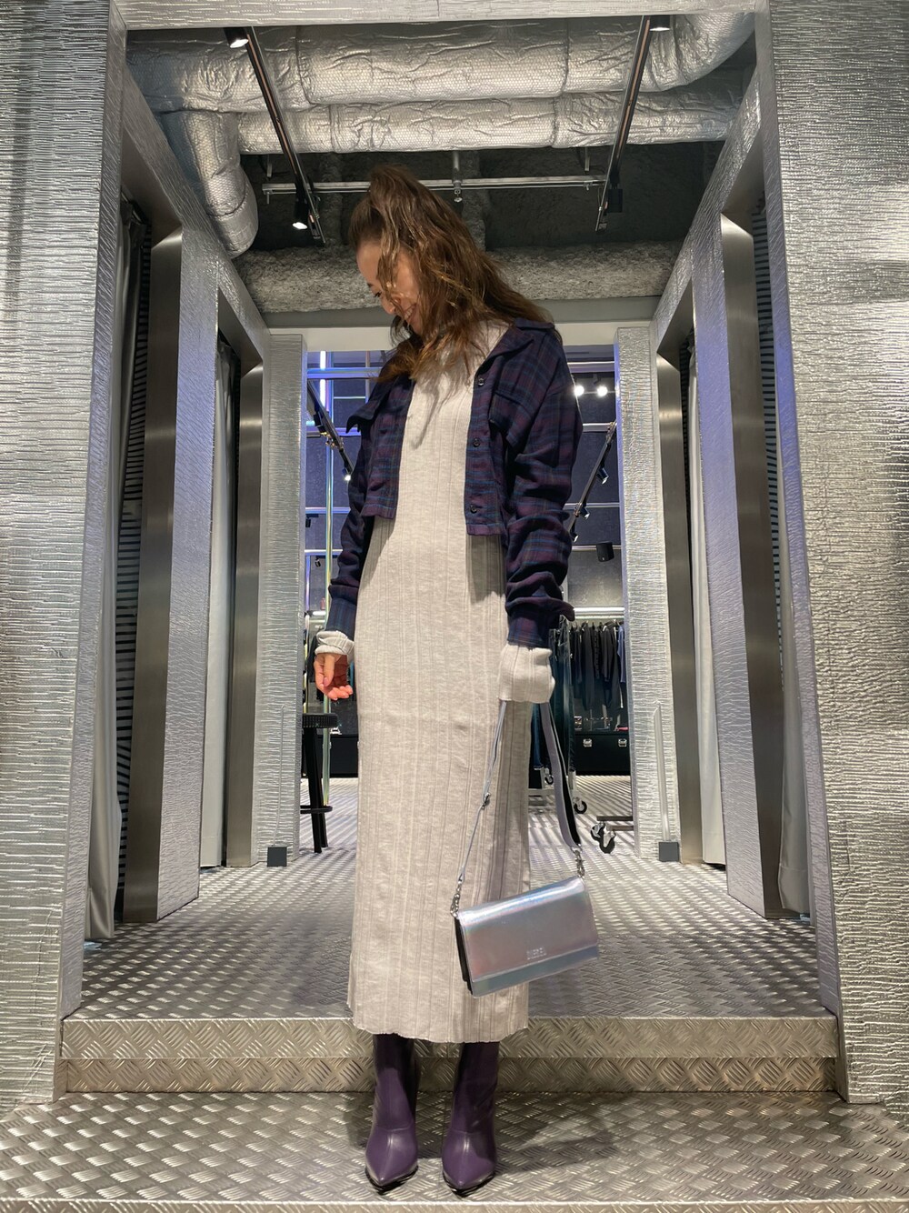 P-のワンピース「レディース タートルネック ニット リブニット ドロップショルダー マキシ丈」を使ったコーディネート