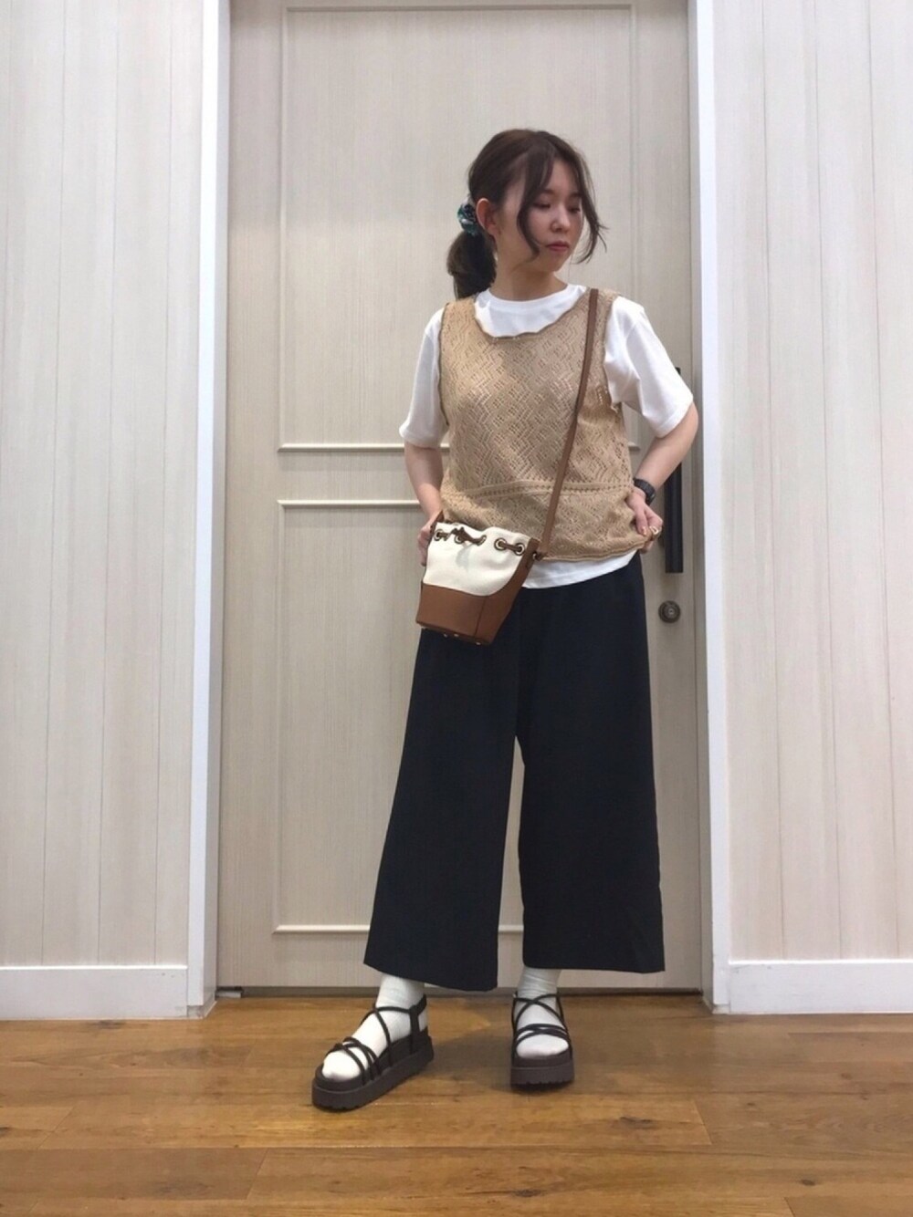 ぴのこ(SHOO・LA・RUE)のベスト「◆【S-L/2点セット】すかし編みニットベスト+Tシャツ」を使ったコーディネート