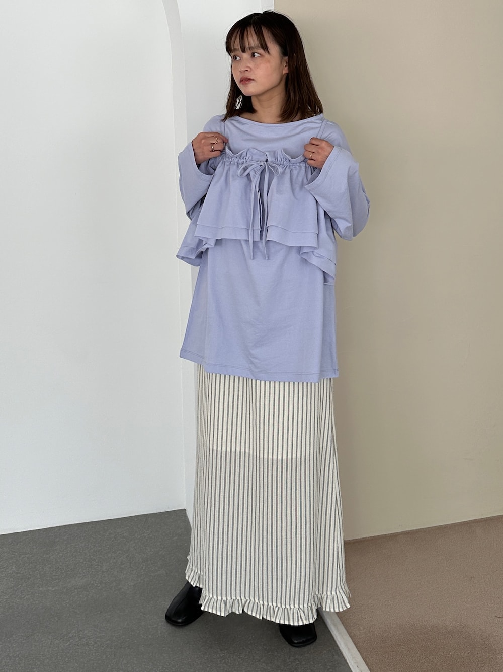 胸元のフリルがガーリーさをプラス✨ スカートは甘さを抑えたものを◎