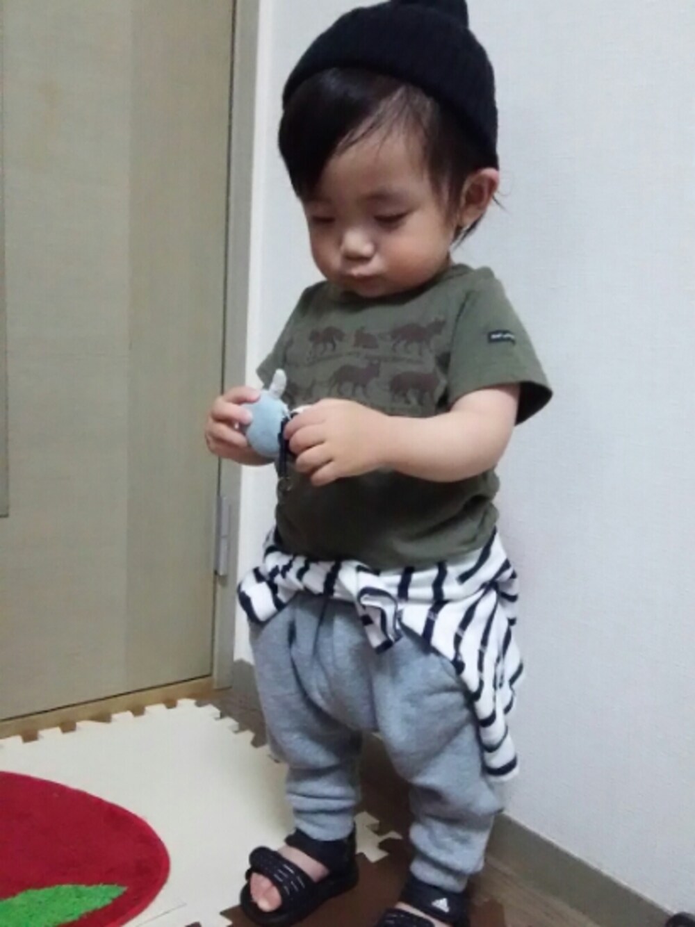 ❤、save、コメント、フォローありがとうございます✨😍✨ ドラフトCO参加中です❤よろしくお願いします😌✨ 本日はカーキのTシャツに(勿論姉からのプレゼント)お気に入りのサルエルパンツをあわせて、ちょっと寂しかったのでボーダーのカーデを腰に巻いてみました🎵 小窓はニット帽を脱ぐ様子。。 何度被せても脱いでくれるから、ちょっぴりイライラしちゃったよ❤笑 夕方暑かったから、嫌だったのかな?💦 それとも予防接種の後だったから、機嫌悪かったのかも……😅 見てくださりありがとうございました✨✨