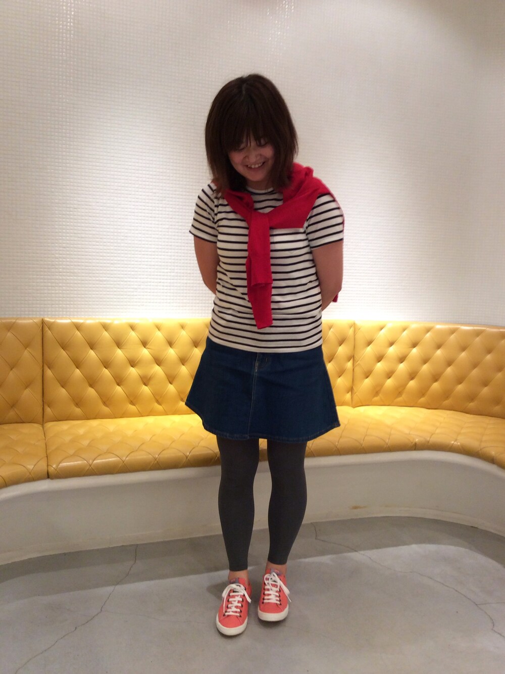 お気に入りのボーダーに定番のデニムスカートで。 スニーカーはビタミンカラーで元気良く!