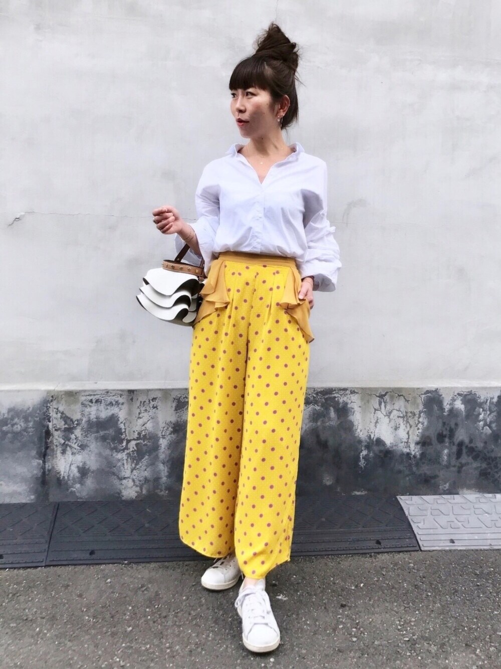 おはようございます ご覧頂きありがとうございます✨ イエローにラベンダーのドットパンツにボリューム袖ブラウス フリルバッグでフリフリ3点セット😂 10センチ髪の毛切ってハリが出たのか、お団子から髪の毛がピンピン出てきます💦 何とか入れ込みました🍡 この前の結婚式ワンピも記念に←小窓📸 ジュエリーは、バタフライネックレスと3本爪一粒ダイヤモンドネックレスの重ね付けです✨ いいね、お気に入り、コメント、フォローまでとっても嬉しいです✨ 初めましての方もよろしくお願いします✨