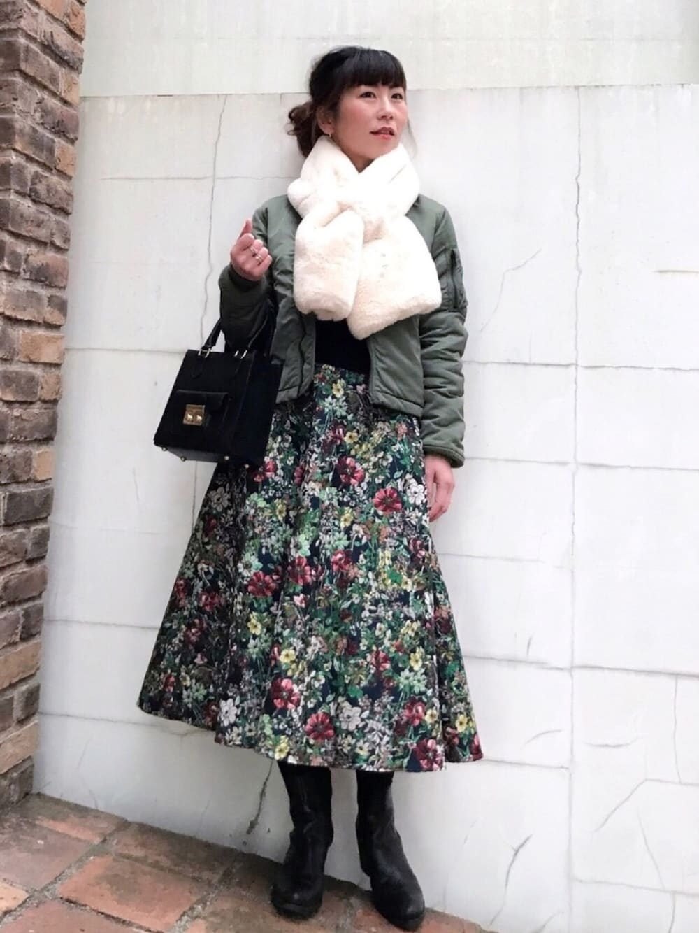 おはようございます✨ 今月もよろしくお願いします🙇♀️ フワフワ触り心地抜群のエコファーストール まさにバニラアイス色←白っぽく写ってますが… 暖かくて幸せな気分になれます(笑) 寒かった昨日 久しぶりにMA-1 ジャガード花柄スカートに何年も愛用のサイドゴアブーツ インナーは洗えるユニクロのVネックニット ジュエリーは、新作の合わせやすいシンプルフープピアスに マーキスシルエットのダイヤモンドピアスを合わせました✨ 見て頂きありがとうございます✨