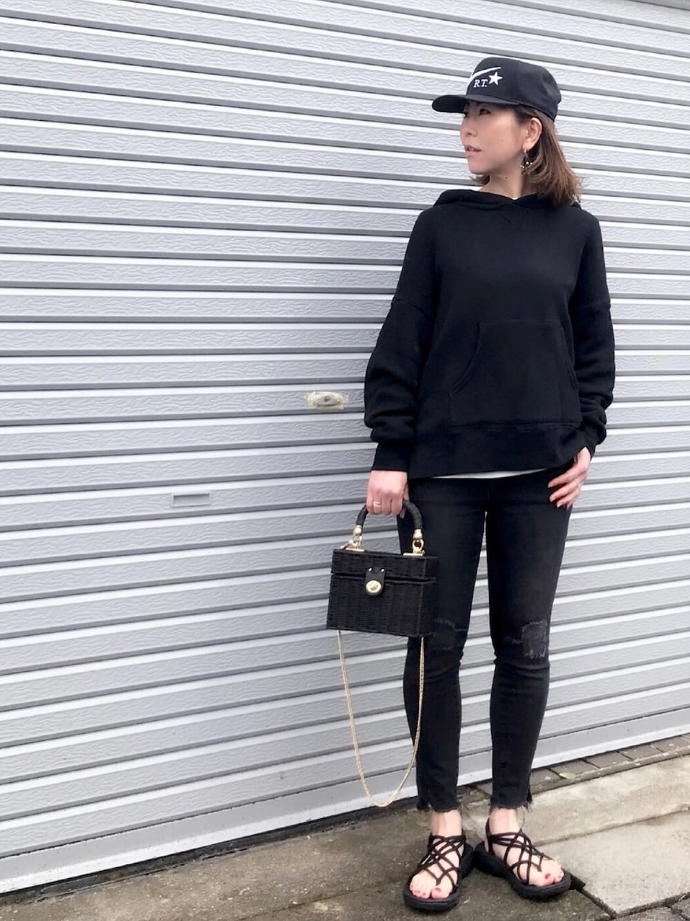 おはようございます✨ 黒パーカーにスキニー 休日カジュアル キャップのロゴが目立ちすぎたかな? 寒かったのにサンダル履いて足から冷えました 勝手にオールブラック祭り参戦 ジュエリーは、ハーフエタ二ティリングと 一粒ダイヤモンドリングの重ね付けです✨ 見て頂きありがとうございます✨