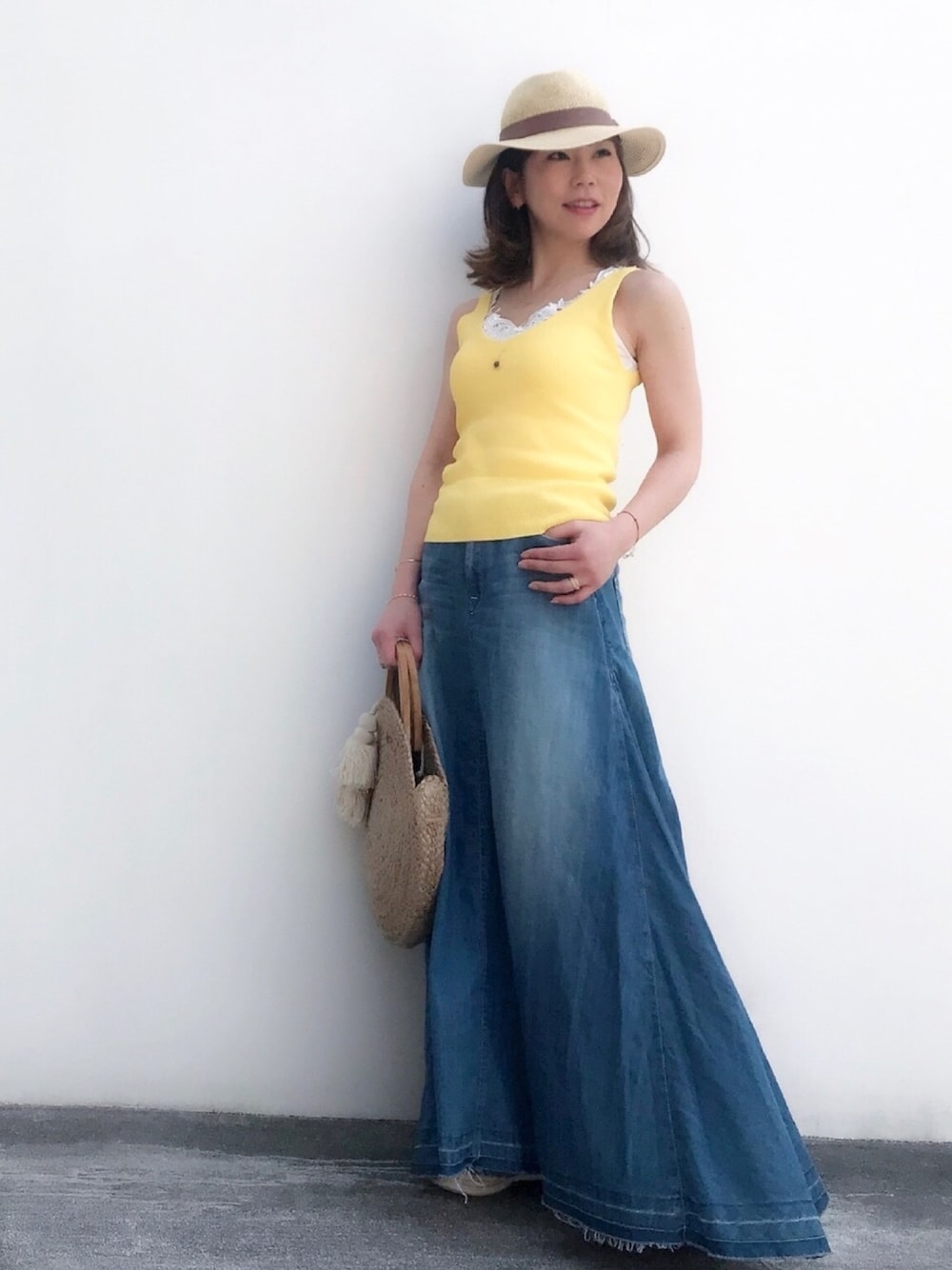 おはようございます✨ 暑かった月曜のコーデ イエローのノースリニットに マキシ丈デニムスカート 羽織は白の花刺繍ジャケットでした←写真なし ジュエリーは、オープンスターチャームを45センチチェーンに通して 定番人気の5本爪で星にも見える一粒ダイヤモンドネックレスと重ね付けしました✨ 見て頂きありがとうございます✨