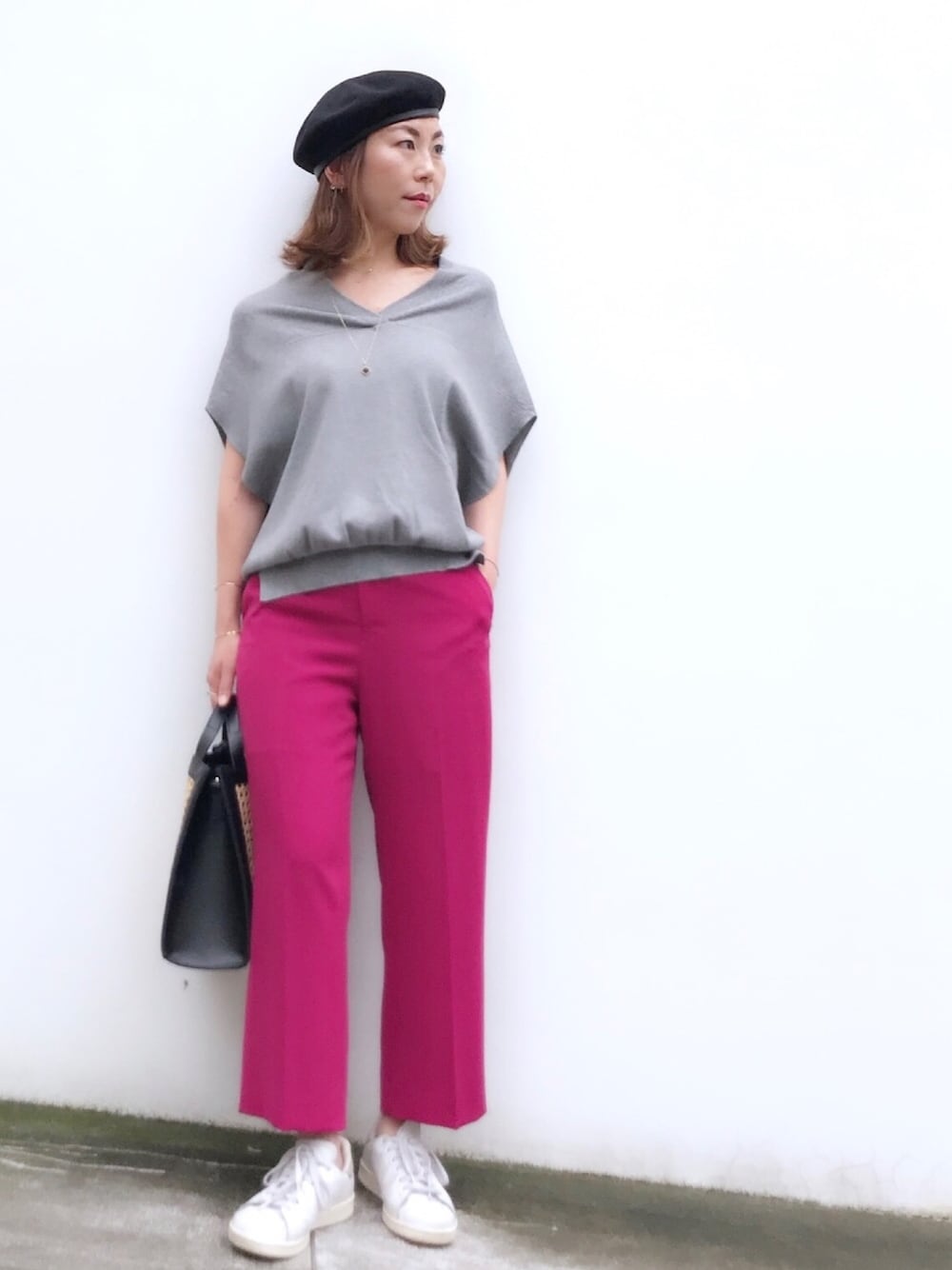 おはようございます✨ グレー×ピンク 昨日は肌寒いくらい こんな日こそ夏のニットが役立ちます ジュエリーは、ドットのイニシャルネックレスに ラウンドの一粒ダイヤモンド風ネックレスをアジャスターを使って37センチにして重ね付けしました✨ 見て頂きありがとうございます✨