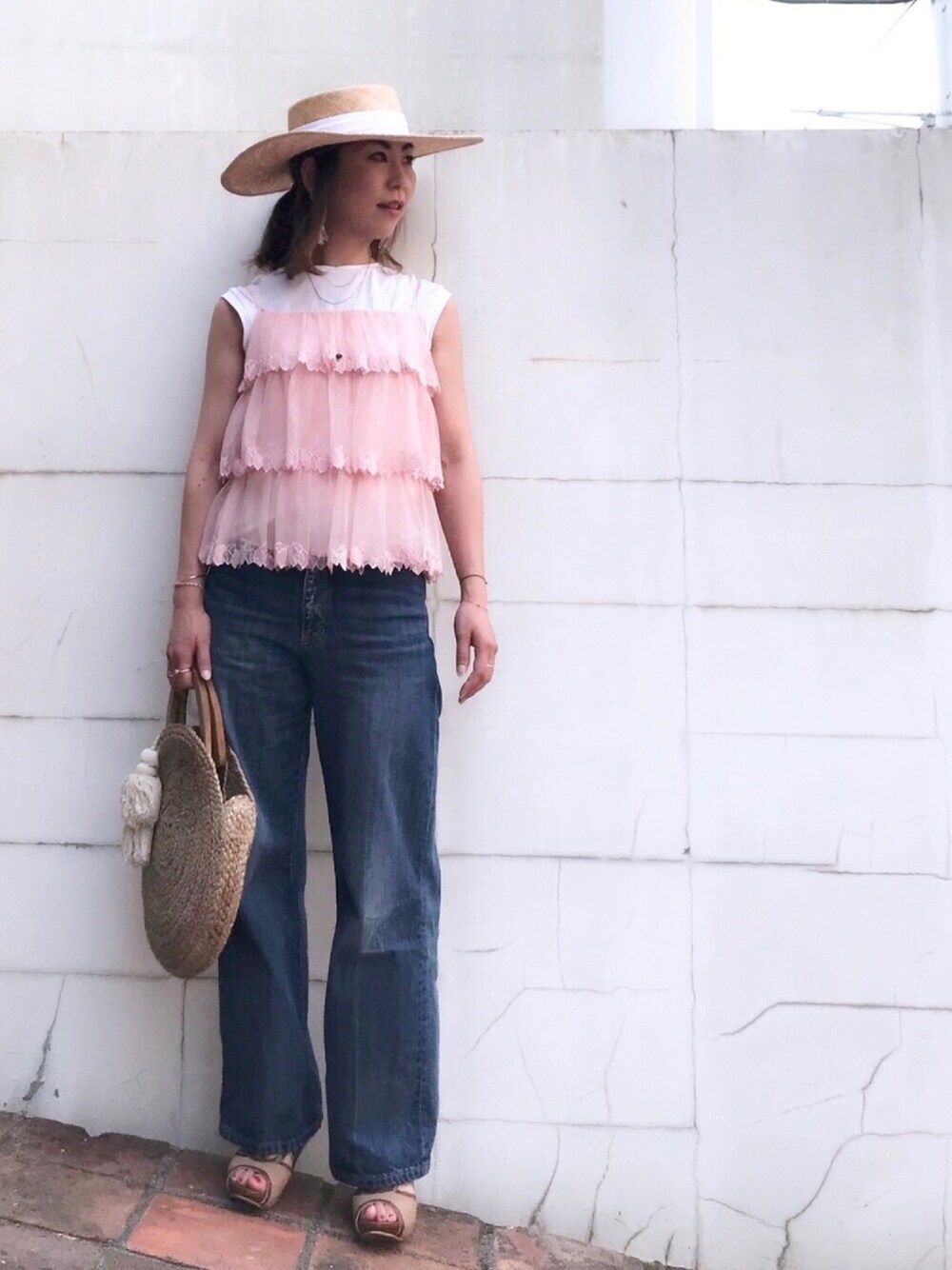 おはようございます✨ ピンクのフリルキャミに ワイドデニム 甲のデザインが好みのサンダルで フェス参加です よろしくお願いします ジュエリーは、一粒ダイヤモンドの三つ編みリングに シンプル華奢リングを重ね付けしました✨ 見て頂きありがとうございます✨