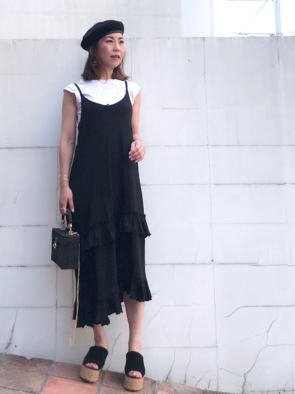 おはようございます✨ キャミワンピにベレー帽で モノトーン ジュエリーは、一粒ダイヤモンドのチェーンリングに シンプル華奢なねじりリングを重ね付けしました✨ 見て頂きありがとうございます✨