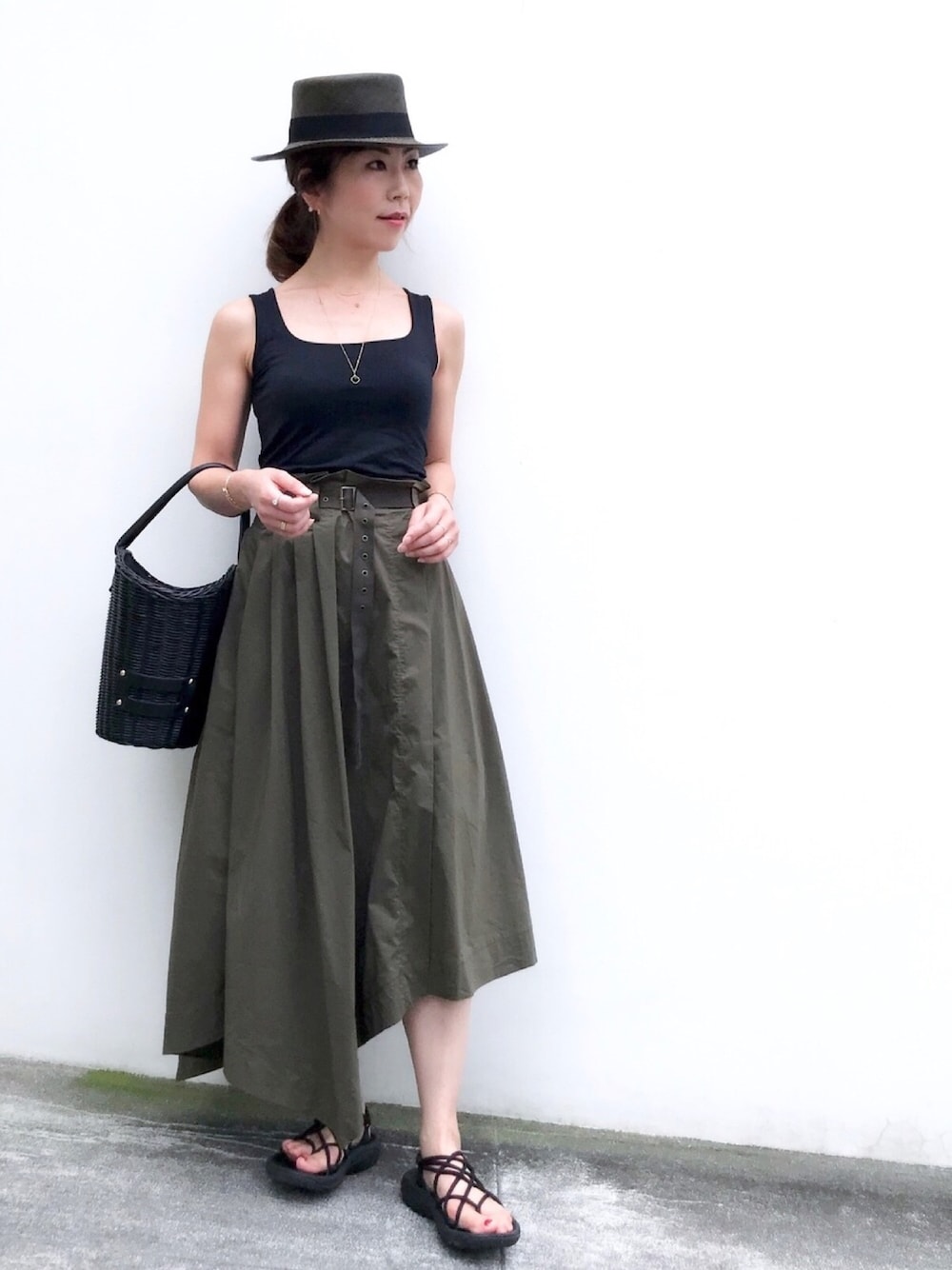 おはようございます✨ カーキの巻きスカートに スクエアネックのタンクトップ ジュエリーは、ツチメベースでプリンセスカットの一粒ダイヤモンドリングに シンプルベーシックな華奢リングを合わせました✨ 見て頂きありがとうございます✨