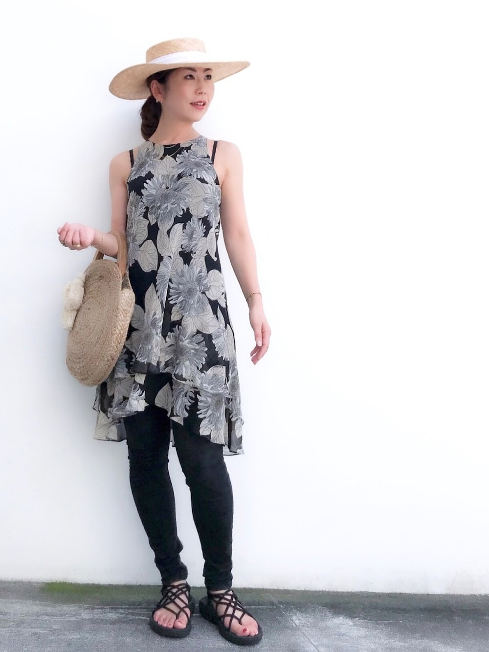 おはようございます✨ ひまわり柄のワンピースに 黒スキニー ジュエリーは、極小ハートの華奢リングに ツチメのシンプルリングを合わせました✨ 見て頂きありがとうございます✨