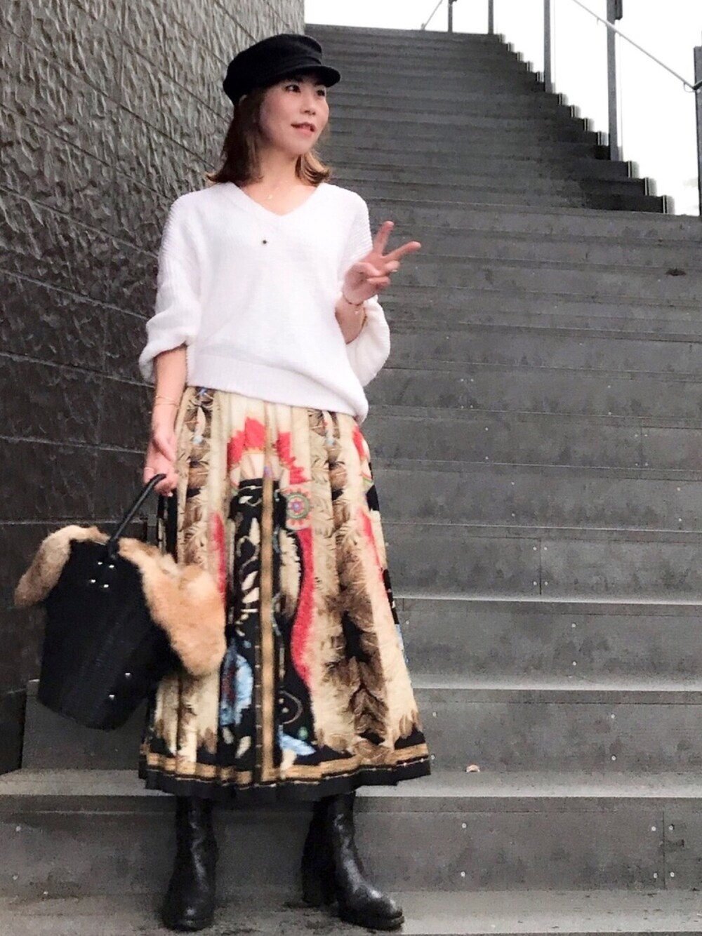 おはようございます✨ ラブアンドピースプロジェクト2018に賛同します オーバーサイズの白ニットに フェザー柄スカート ニットは袖のボリューム感が好み 深めのVと全体的なシルエットもすごく綺麗 綿麻なので今時期ちょうど良い ジュエリーは、フェザーモチーフチャームを40センチチェーンに通して 2本爪の一粒ダイヤモンドネックレスと重ね付けしました✨ 見て頂きありがとうございます✨