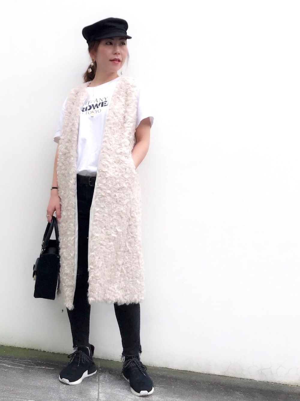 おはようございます✨ エコファーのロングベストを羽織に インナーは黒スキニーにロゴT ジレは羽織る時期に悩むけど ライダースの上に着ても可愛いと思う クルリンな毛足と 絶妙な色もお気に入りです かなり暖かい ジュエリーは、人気のナンバー紐ブレスに 一粒キュービックジルコニア紐ブレスを重ね付けしました✨ 見て頂きありがとうございます✨