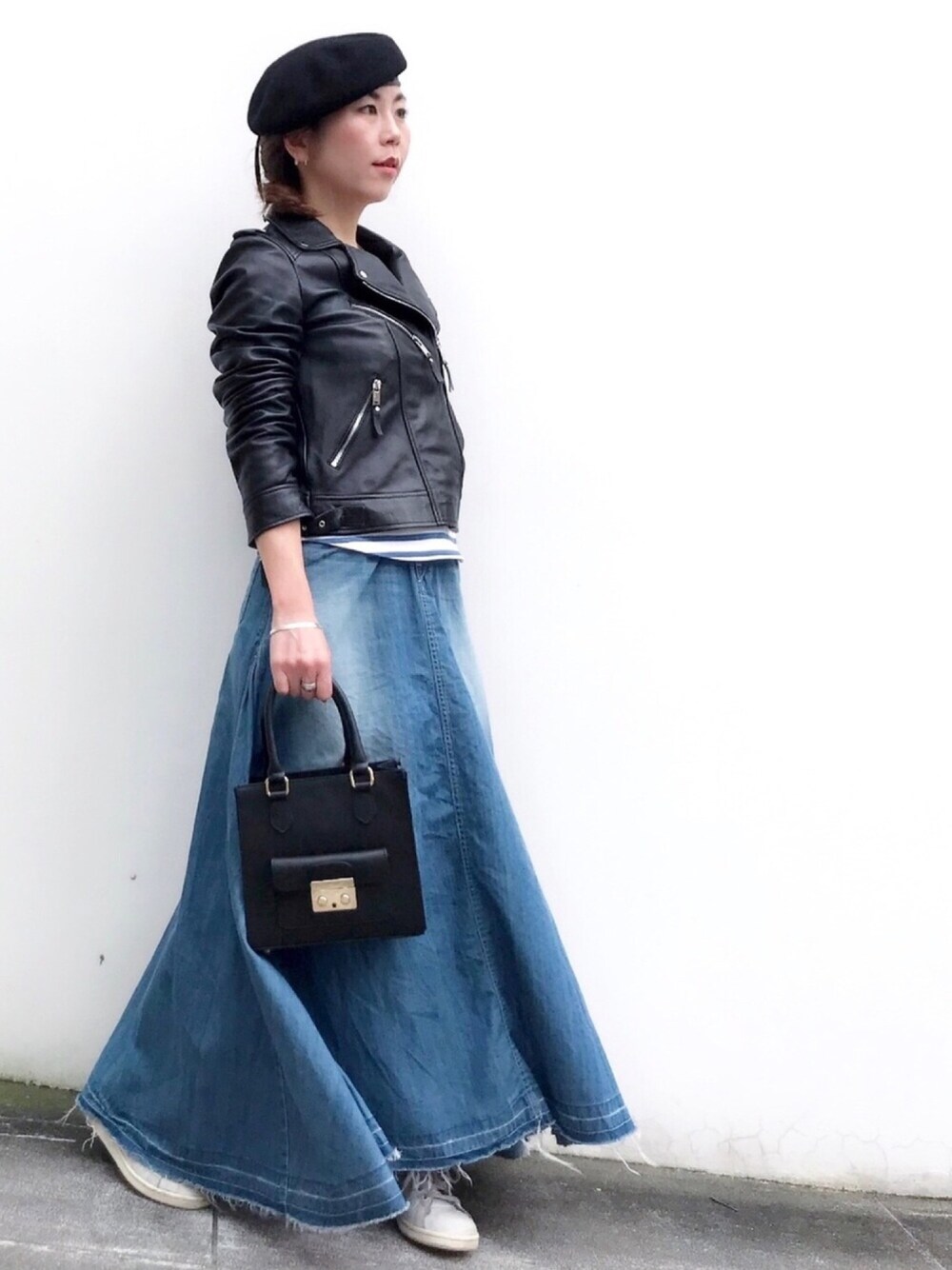 おはようございます✨ マキシ丈のデニムスカートに ライダース前閉め インナーはボーダー ジュエリーは、チェーンのシルバーバングルに 新作ハートのボリュームシルバーリングを合わせました✨ 見て頂きありがとうございます✨