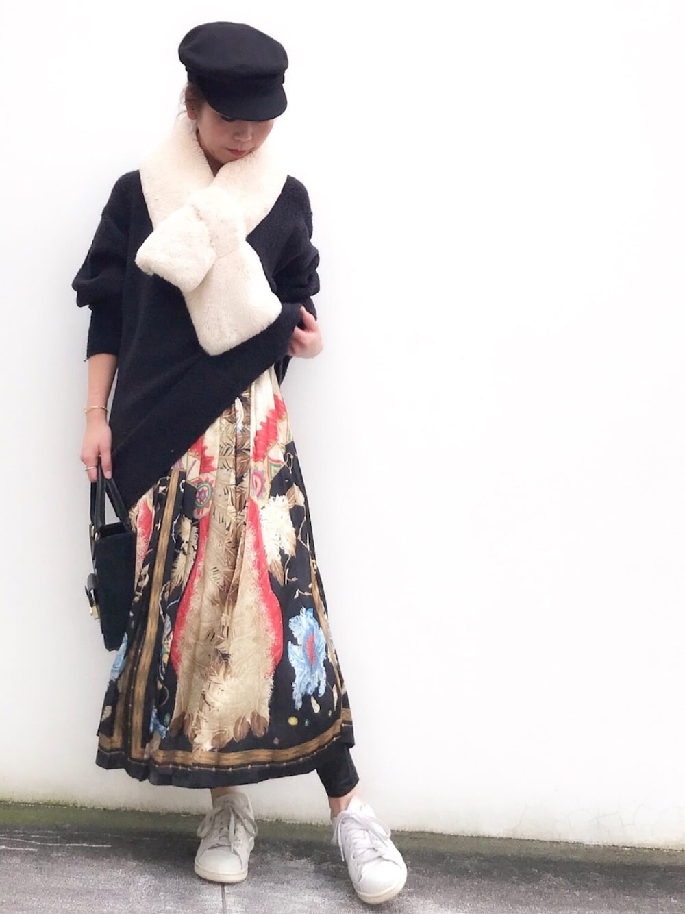 おはようございます✨ フェザー柄スカートに、レギンス ボリュームニットにエコファーマフラー ジュエリーは、限定の10金ホワイトゴールドの8本爪一粒ダイヤモンドネックレスに ダイヤモンドネックレスを重ね付けしました✨ 見て頂きありがとうございます✨