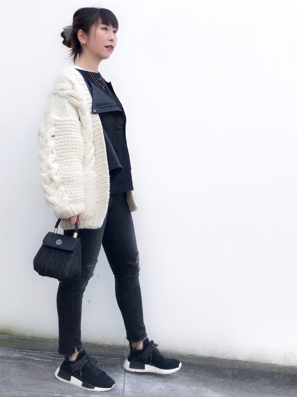 おはようございます✨ ワッフルTにライダースと ざっくりニットカーディガン ジュエリーは、ナンバーチャームを65センチチェーンと50センチチェーンに通して付けました 見て頂きありがとうございます✨