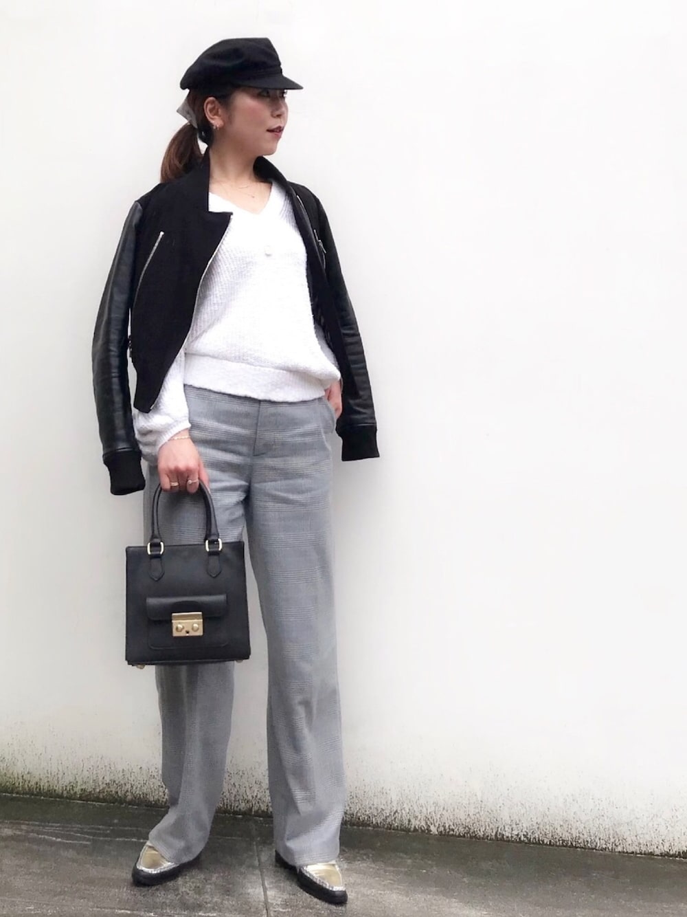 おはようございます✨ ライダースに白ニットとチェックパンツ ジュエリーは、極小イニシャル華奢リングに シンプルボールチェーンピンキーリングを合わせました 見て頂きありがとうございます✨