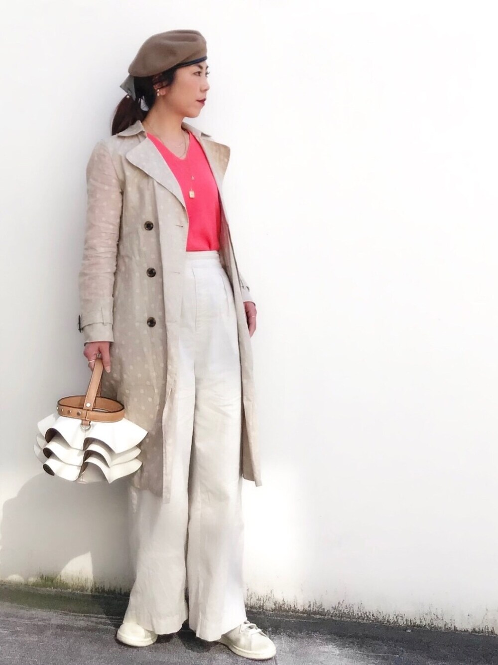 おはようございます✨ サーモンオレンジのニットにドットのトレンチ バニラカラーのパンツ ジュエリーは、ガーネットリングと ツチメの華奢リングを合わせました 見て頂きありがとうございます✨