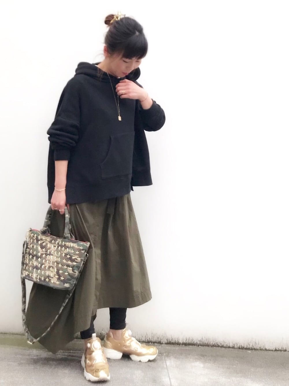 おはようございます✨ パーカーにスカートとレギンス 小物でゴールドをプラス ジュエリーは、人気のロクボウセイコードブレスレットに 極小イニシャルブレスレットを合わせました 見て頂きありがとうございます✨