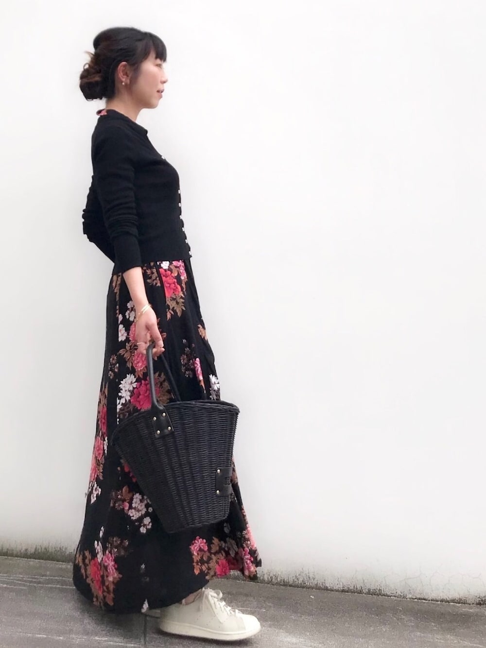 おはようございます✨ 花柄ワンピに黒カーディガン デニム履いてますがあまり見えません… ジュエリーは、バングルを4本重ね付け 見て頂きありがとうございます✨
