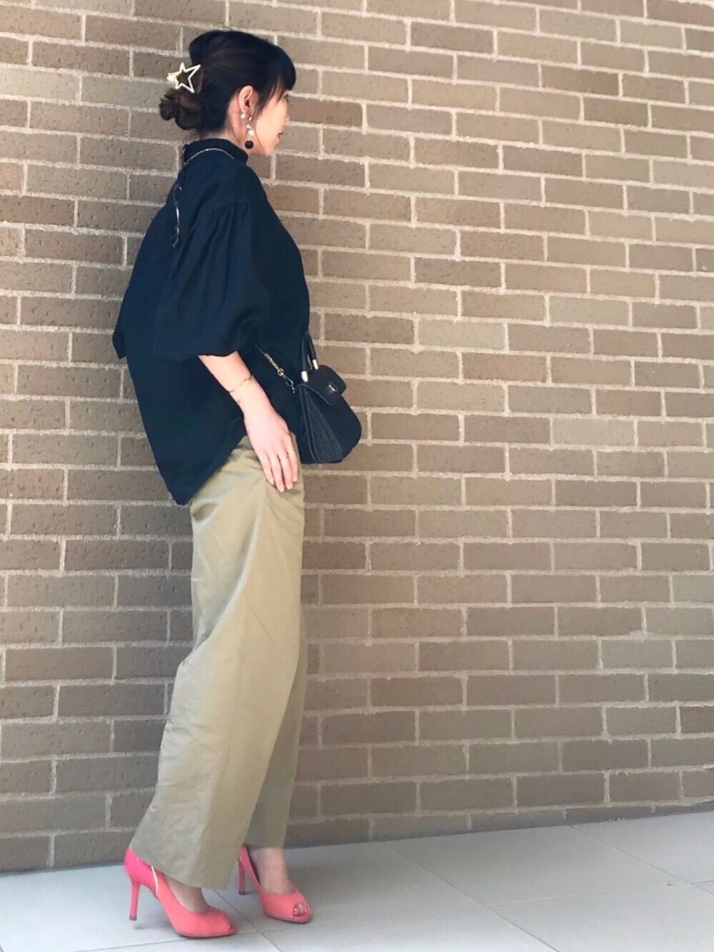 おはようございます✨ 後ろボタンのリネンブラウス 黒×カーキ 差し色ピンク ジュエリーは、華奢リングを重ねずに並べて合わせました 見て頂きありがとうございます✨