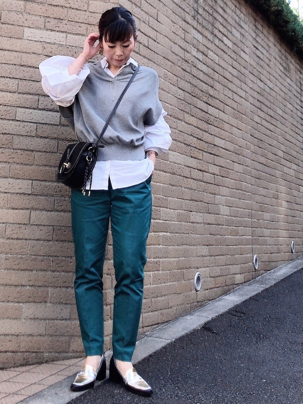 おはようございます✨ グリーンのテーパードパンツに ボリューム袖ブラウスとベスト ジュエリーは、人気のサテンブレスレットに近日発売のブレスレットを重ね付けしました 見ていただきありがとうございます✨
