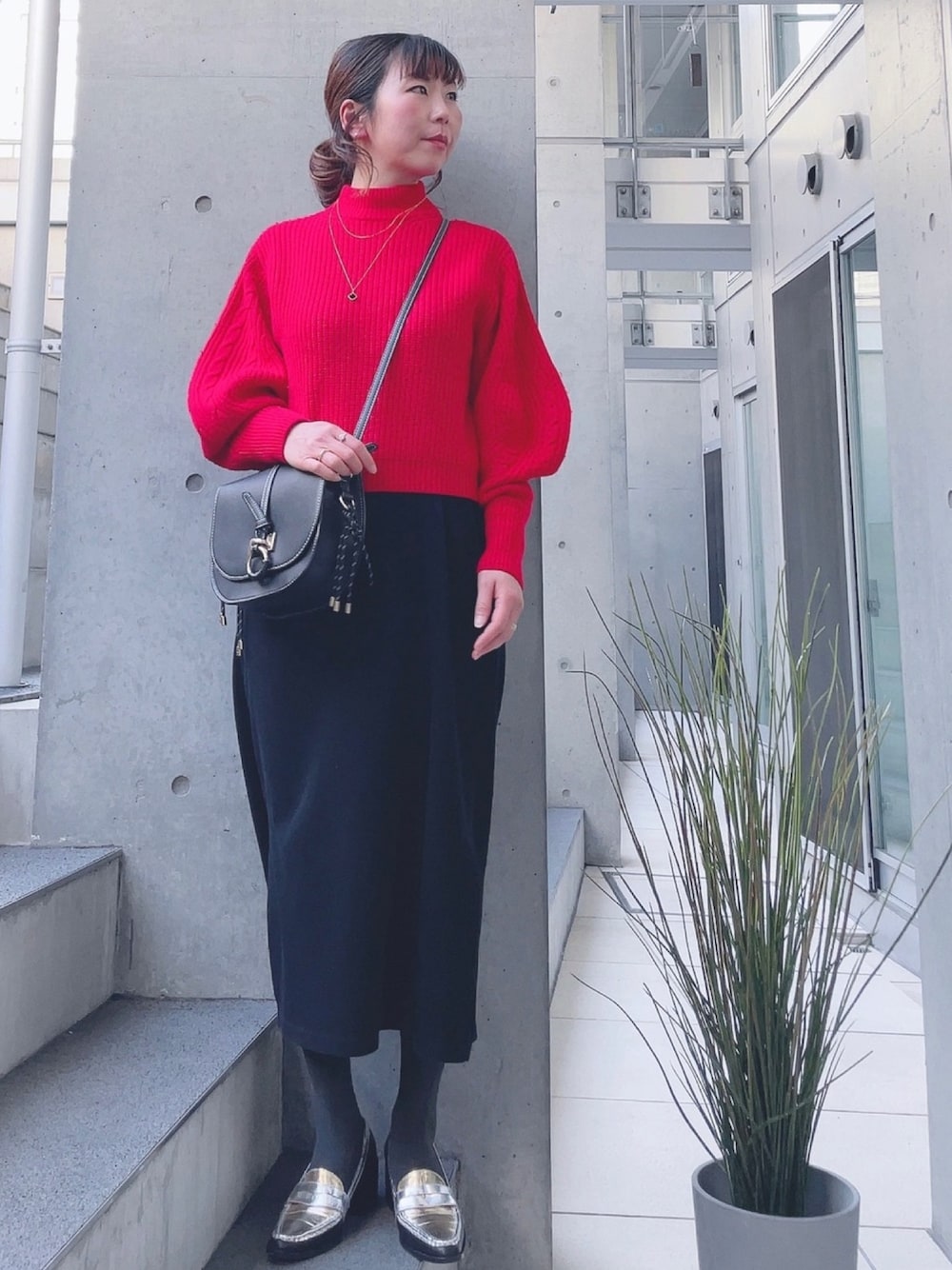 おはようございます ボリューム袖赤ニット 中はワンピース 見ていただきありがとうございます