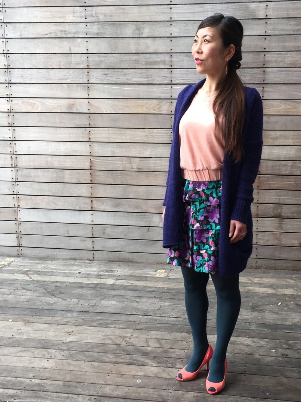 まだまだ寒いので、ニットコーデ^^ 色だけ春を意識して、ピンクのカットソーに柄スカート。 黒だと重い感じがしたので、モスグリーンのタイツです。 ピンクのカットソーはパフスリーブの半袖。 案外着る時期が少なくて、インナーの差し色に丁度良いことが判明しました♪ ピンクに合わせて コーラルネックレスと一粒ダイヤモンド ネックレスの重ね付け。 お花柄のスカートに合わせてフラワー ダイヤモンド ピアスを付けてます。 ジュエリーは小窓でご覧くださいませ★
