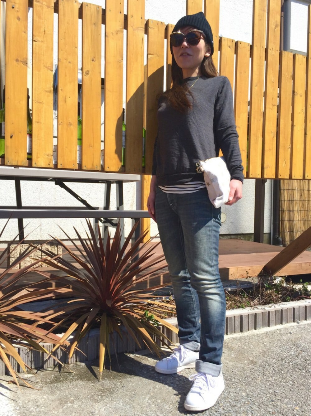 休日カジュアルシンプルコーデ^^ グレーのハイゲージニットにデニム。 インナーにボーダーのタンクトップです。 ランチを食べにピザ屋さんへ行ってきましたよ♪ 新鮮野菜でとても美味しいのです^^ 最近ハマってます。 ジュエリーは、イニシャルブレスレットにエポキシ 白のフラワー ブレスレットの重ね付けです。 ジュエリーのアップは小窓でご覧下さい〜♪