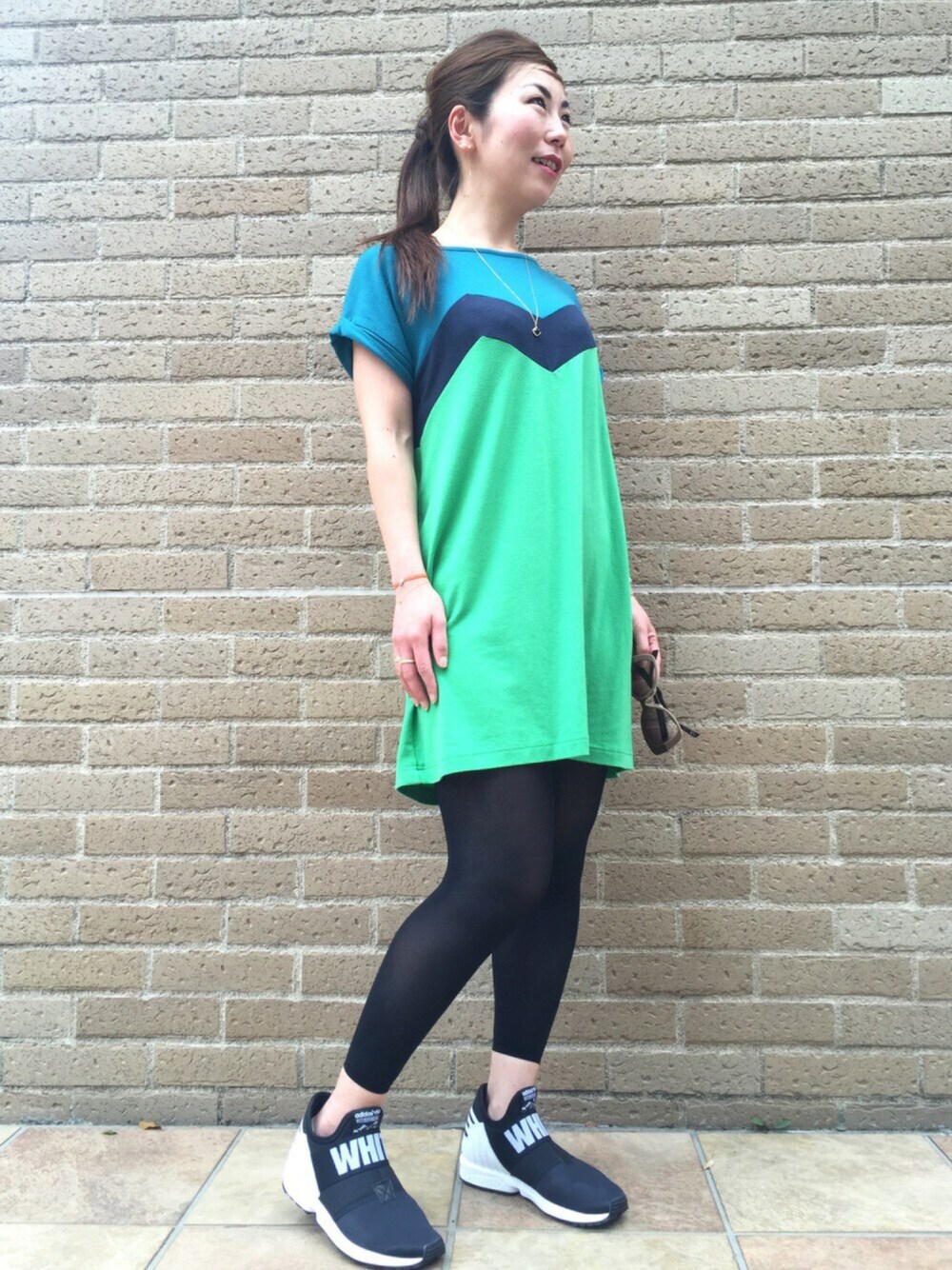 グリーンが派手目なカットソーワンピースです♪ シンプルにスニーカー&レギンス♬ 初夏ですね〜 サングラスありと、ポニーテールは小窓で^^ ポニーテールは、下気味で結んで一部を三つ編み、巻き付けました♬ 初夏には紐ブレスがよく似合うので、PRAY for Japan ブレスレット オレンジと 一粒ダイヤモンド ブレスレットの重ね付けです。 ジュエリーは小窓でアップをご覧下さい〜